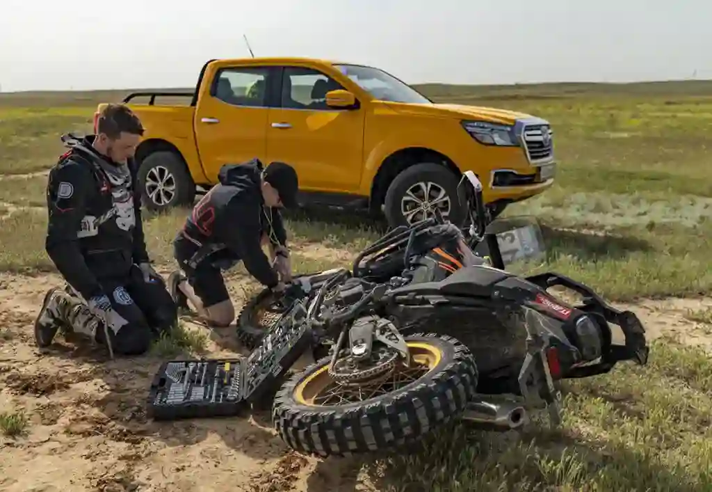 Первые 50 км, по словам мотоциклистов, оказались особенно сложными — на «рваной» жесткой трассе руки забивались как на мотокроссе. Затем начались песчаные прямики, требовавшие хорошей скорости, и гонщики наконец-то смогли открыть газ. К сожалению, когда на одном из GR 500 лопнула шина, до финиша оставалось еще почти 200 км: пришлось ждать механиков с новой покрышкой, однако больше никаких неприятностей не произошло, и до финиша второго спецучастка байки доехали.